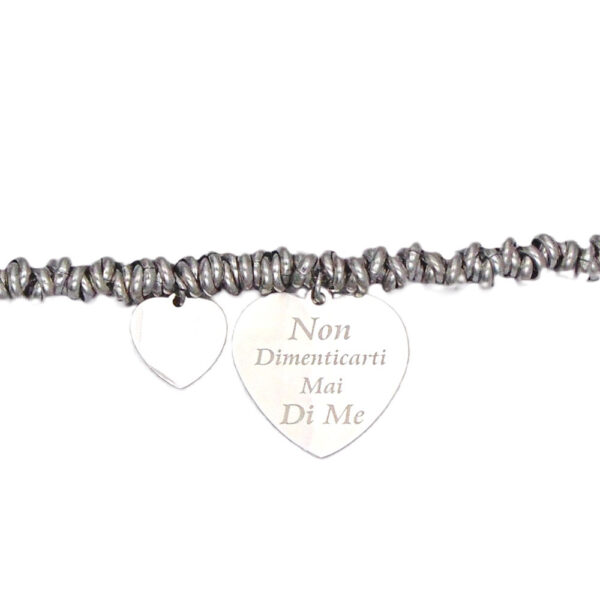 Questo bracciale è un regalo speciale per chi vuoi bene. È realizzato in acciaio 316L anallergico, un materiale resistente e lucido che non si ossida né si scolorisce. Il bracciale ha una forma intrecciata che lo rende elegante e originale. Al bracciale sono appesi due ciondoli a forma di cuore, uno dei quali ha una scritta che dice “Non Dimenticarti Mai Di Me”. Questa frase esprime il tuo affetto e il tuo legame con la persona a cui lo regali. Il bracciale è adatto a tutti i tipi di polso, grazie alla sua chiusura regolabile. È un accessorio che si abbina facilmente a qualsiasi outfit, sia casual che formale. Regala questo bracciale a chi ami e fagli sapere che sei sempre con lui o lei.