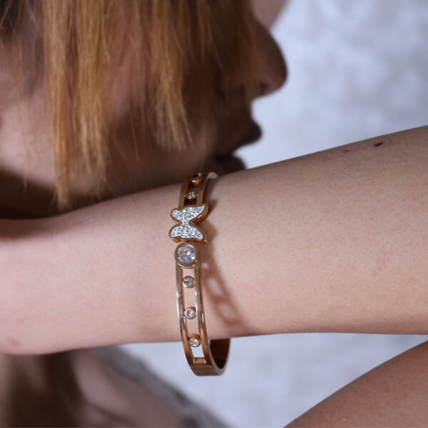 Aggiungi un tocco di eleganza e raffinatezza al tuo look con questo splendido bracciale rigido in acciaio inossidabile anallergico. Questo bracciale è realizzato con materiali di alta qualità che garantiscono comfort e durata. Il design delicato e sofisticato presenta una farfalla incastonata di pietre scintillanti che cattura la luce e lo sguardo. Il bracciale è facile da indossare e da abbinare con qualsiasi outfit, grazie alla sua finitura lucida e al suo colore neutro. Questo bracciale è perfetto per ogni occasione, sia che tu voglia aggiungere un po’ di glamour al tuo abbigliamento quotidiano, sia che tu voglia brillare in una serata speciale. Non lasciarti sfuggire questo bracciale rigido in acciaio inossidabile anallergico, un accessorio che non può mancare nella tua collezione.