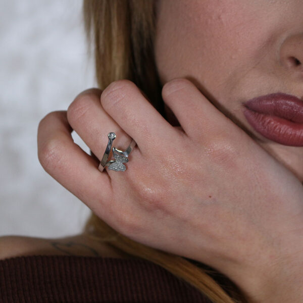 Questo anello in acciaio inossidabile presenta un design unico e moderno con una forma curva, impreziosita da una farfalla brillantinata. Elegante e raffinato, è perfetto per aggiungere un tocco di sofisticatezza e stile a qualsiasi outfit.