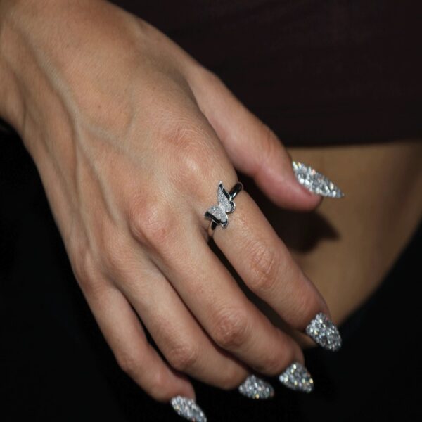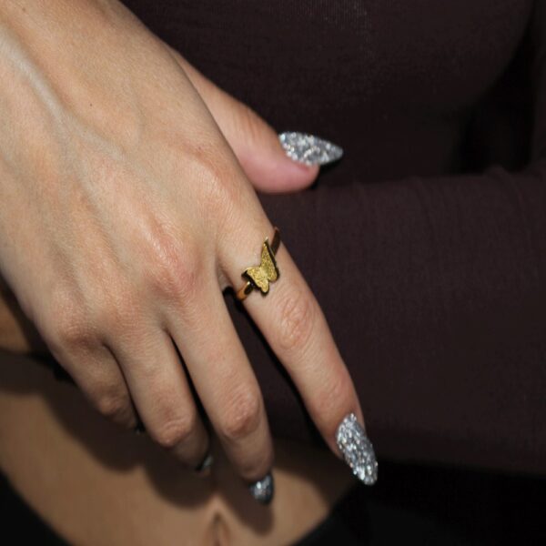 Questo anello è un accessorio delicato e femminile, perfetto per aggiungere un tocco di luce al tuo look. Realizzato in metallo dorato, presenta un’incantevole farfalla impreziosita da glitter scintillanti. La farfalla simboleggia la trasformazione, la libertà e la bellezza, ed è un regalo ideale per te o per una persona speciale. L’anello ha una fascia liscia e lucida, che si adatta comodamente al dito.
