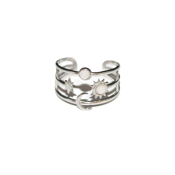Questo anello in acciaio 316L inossidabile è un pezzo di gioielleria distintivo, perfetto per aggiungere un tocco di stile e personalità al tuo look. L’anello è aperto e regolabile, adattandosi a diverse misure di dito. Presenta dei disegni intricati che includono un motivo a stella e sole, che aggiungono al suo fascino estetico. Al centro dell’anello, c’è una piccola pietra preziosa o pezzo metallico circolare che si distingue contro la base lucida in acciaio. La superficie dell’anello è lucidata e riflette la luce, evidenziando la sua dettagliata lavorazione. L’anello è leggero e probabilmente comodo da indossare ogni giorno.