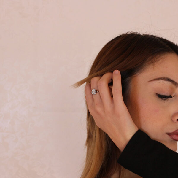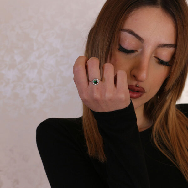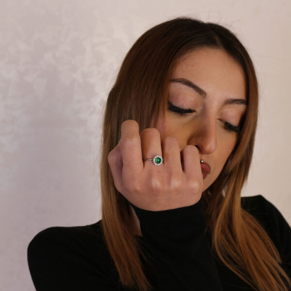 Un raffinato anello in acciaio inossidabile, caratterizzato da una pietra centrale  brillante, circondata da piccoli diamanti o zirconi. Perfetto per aggiungere un tocco di eleganza e colore al tuo stile quotidiano o per occasioni speciali.