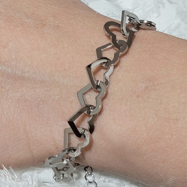 Questo bracciale è un gioiello di qualità e di classe, realizzato in acciaio inossidabile 316L. Il bracciale presenta una serie di anelli a forma di cuore che si collegano tra loro, formando una catena elegante e originale. L’acciaio inossidabile 316L è un materiale di alta qualità, che non si rovina né si scolora con il tempo. Il suo colore argento riflette la luce e rende il bracciale luminoso e brillante. Il bracciale ha una chiusura a moschettone che permette di regolare la lunghezza in base al polso, offrendo una vestibilità confortevole e sicura. Questo bracciale è il complemento perfetto per il tuo outfit, aggiungendo un tocco di femminilità e di stile.
