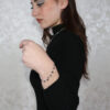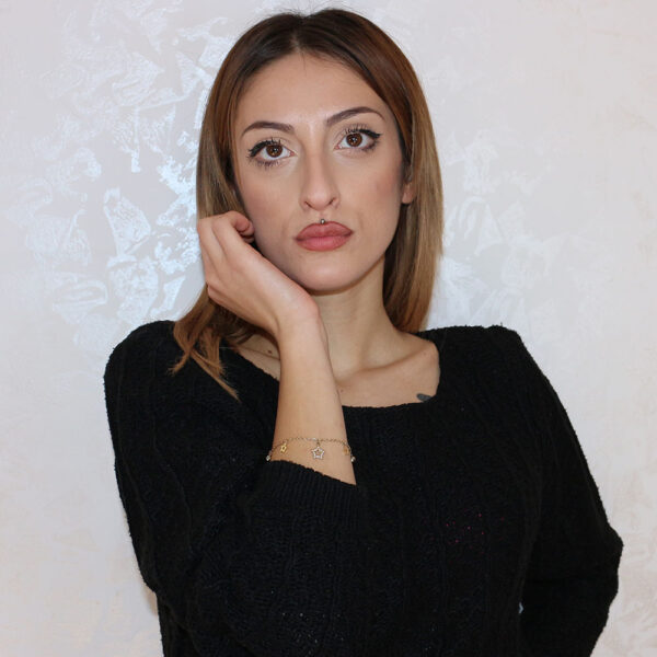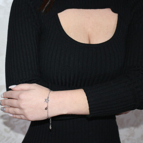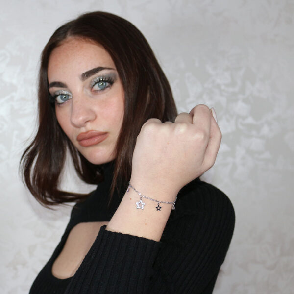Un elegante bracciale a catena sottile di colore dorato, impreziosito da tre ciondoli a forma di stella. Il ciondolo centrale, decorato con cristalli scintillanti, è affiancato da due stelle più piccole e semplici. Perfetto per aggiungere un tocco di glamour e raffinatezza a qualsiasi outfit.