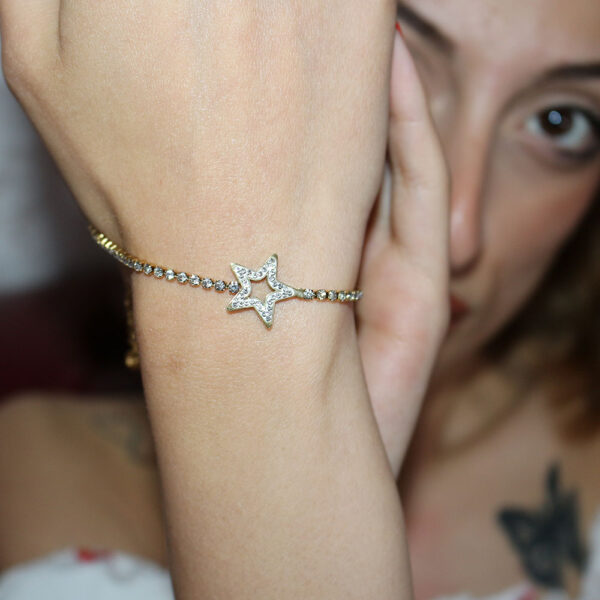 Scopri l’eleganza di questo bracciale in acciaio inossidabile, caratterizzato da una catena sottile e delicata, impreziosita da piccoli cristalli incastonati lungo tutta la lunghezza. Al centro del bracciale, un affascinante ciondolo a forma di stella, decorato con cristalli scintillanti, aggiunge un tocco di luce e raffinatezza al tuo stile. Perfetto per ogni occasione, questo bracciale versatile è l’accessorio ideale per chi desidera un mix di eleganza e originalità. Indossalo con qualsiasi outfit per aggiungere un tocco di glamour e catturare l’attenzione di tutti.
