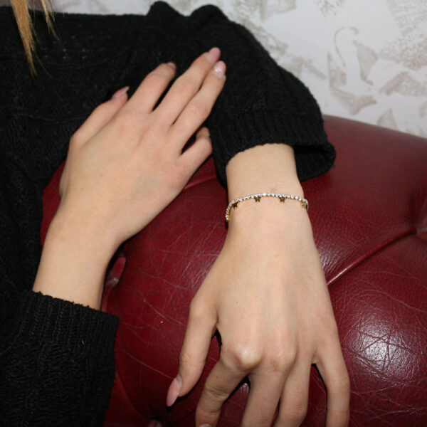Se cerchi un bracciale che unisca eleganza e fantasia, questo è il modello che fa per te. Realizzato in acciaio inossidabile di alta qualità, questo bracciale è impreziosito da piccole pietre scintillanti e da charm a forma di stella in metallo dorato. Il design è delicato e raffinato, adatto a qualsiasi occasione. Il bracciale è regolabile e si adatta perfettamente al tuo polso. Un accessorio che non può mancare nel tuo guardaroba, da indossare da solo o da abbinare ad altri bracciali per un effetto ancora più glamour.
