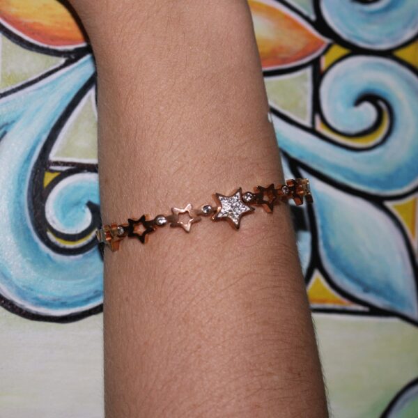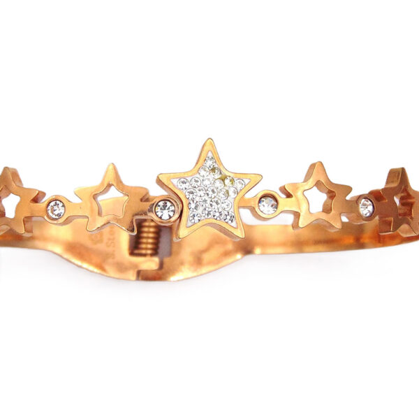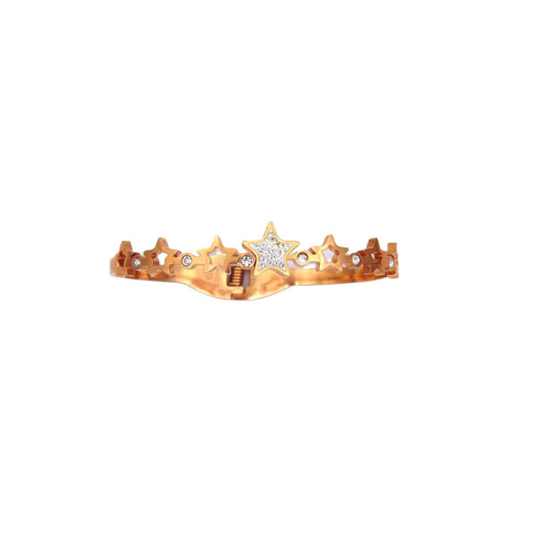 Se ami le stelle, questo bracciale rigido in acciaio laminato bronzo è fatto per te. Questo bracciale è composto da stelle di diverse dimensioni, collegate tra loro da anelli metallici. Al centro, una stella più grande brilla di luce propria, grazie ai brillanti che la decorano. Questo bracciale è un accessorio che non passa inosservato, capace di donare eleganza e personalità al tuo look. Indossalo da solo o abbinato ad altri gioielli, per sentirti sempre una stella.