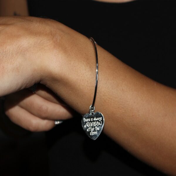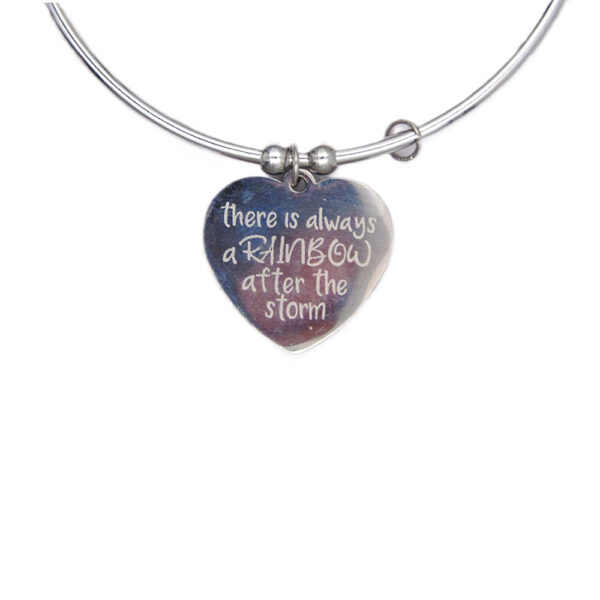 Questo bracciale è un accessorio che unisce eleganza e significato. Realizzato in acciaio inossidabile anallergico di qualità 316L, questo bracciale è durevole e confortevole da indossare. Il ciondolo a forma di cuore pendente dal bracciale è inciso con la frase “There is always a rainbow after the storm”, che trasmette un messaggio di speranza e ottimismo. Questo bracciale è il regalo perfetto per chi ha bisogno di una spinta positiva o per chi vuole celebrare una vittoria personale.