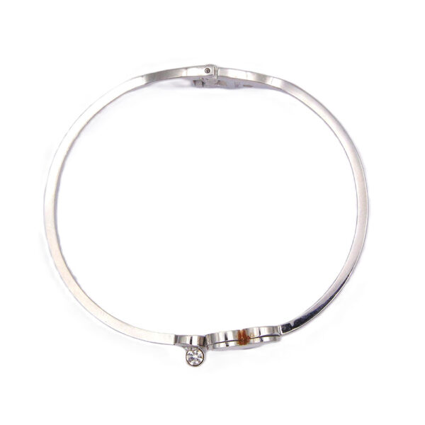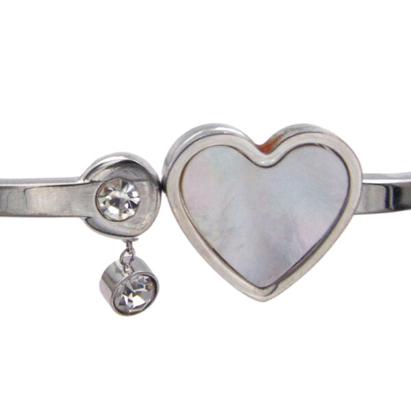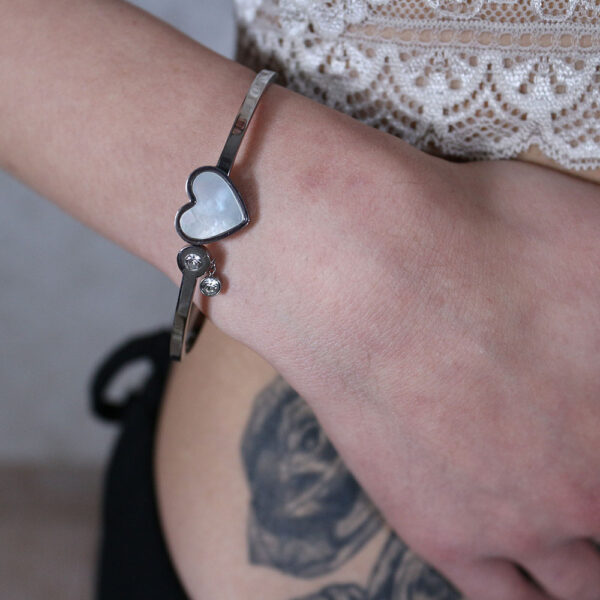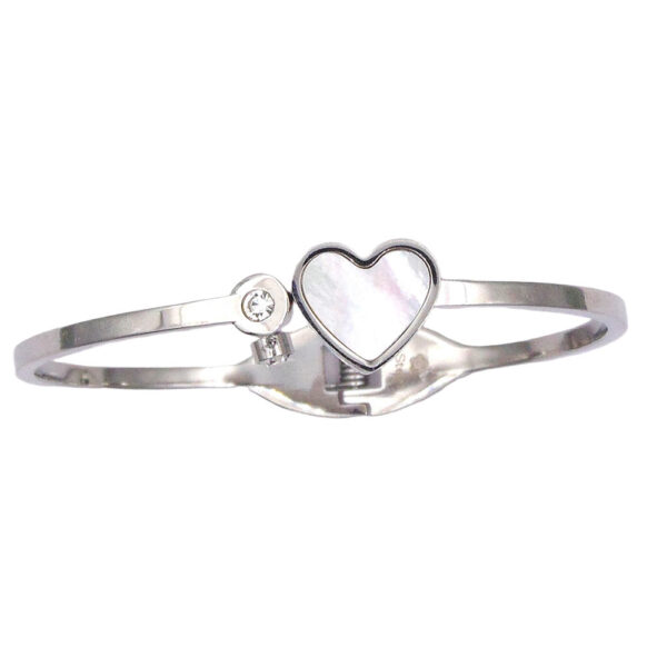 Questo bracciale rigido in acciaio inossidabile è un pezzo elegante e sofisticato, perfetto per aggiungere un tocco di classe a qualsiasi outfit. Con un design semplice ma affascinante, presenta un cuore centrale liscio accanto a una pietra scintillante, offrendo un equilibrio perfetto tra stile moderno e classico.