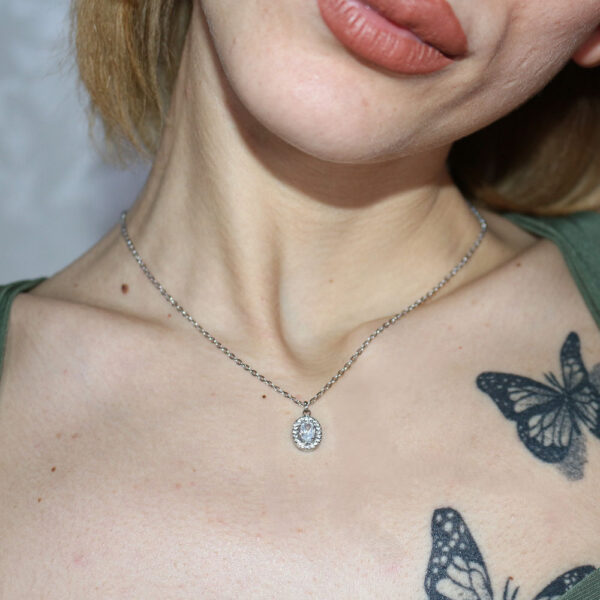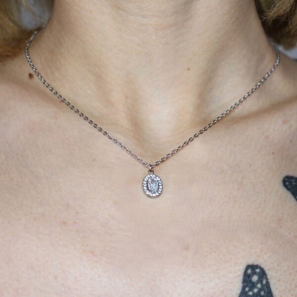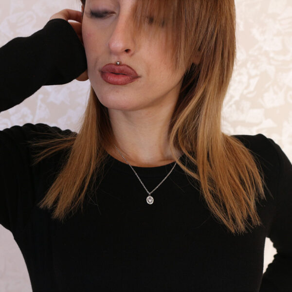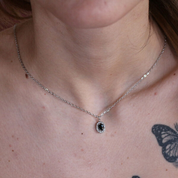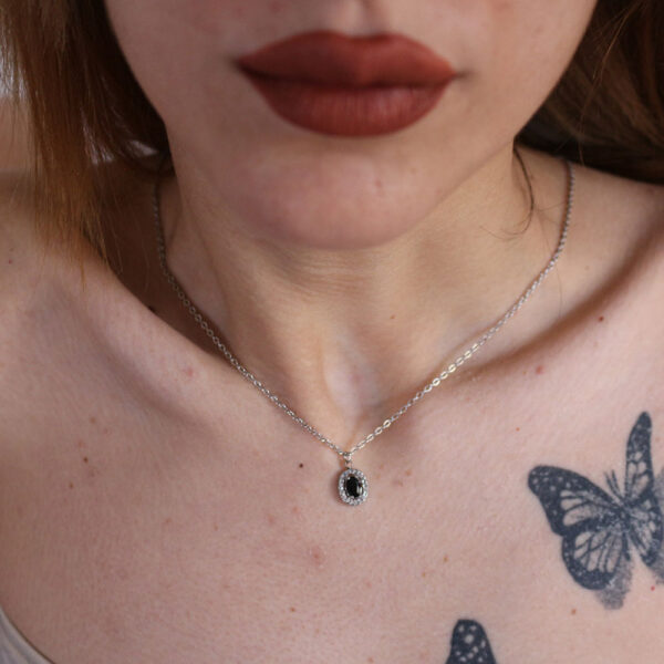 Questa collana in acciaio inossidabile anallergico è un gioiello elegante e sofisticato. La collana presenta un ciondolo ovale incastonato con una pietra nera centrale, circondata da cristalli luminosi che aggiungono un tocco di brillantezza e lusso. La catenina in acciaio è robusta ed elegante, e ha una chiusura a moschettone che ne facilita l’indossamento e la regolazione. Questa collana è un accessorio versatile, che si adatta a diversi stili e occasioni. È anche un’ottima idea regalo per una persona cara, che apprezzerà la qualità e lo stile di questo gioiello.