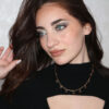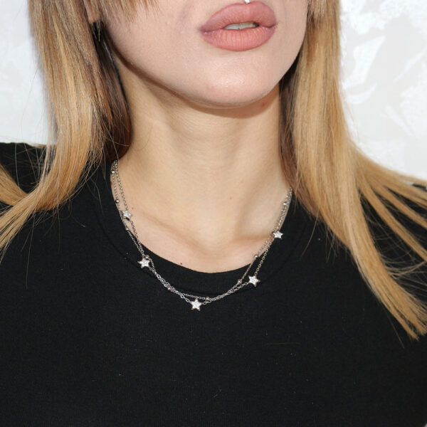 Questa elegante collana in acciaio è composta da due fili sottili, ciascuno decorato con piccoli ciondoli a forma di stella. Le stelle, distribuite uniformemente lungo i fili, creano un effetto delicato e raffinato, perfetto per aggiungere un tocco di eleganza al tuo look quotidiano.