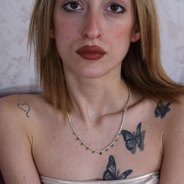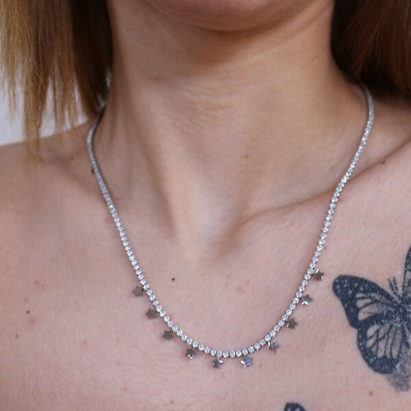 La collana è adornata da piccoli e delicati dettagli che ne aumentano l’eleganza. Lungo la catena sono appesi a intervalli regolari dei pendenti a forma di stella, che donano un tocco di luce e fantasia. La catena stessa è finemente lavorata con cura, riflettendo la luce e aggiungendo un sottile scintillio.