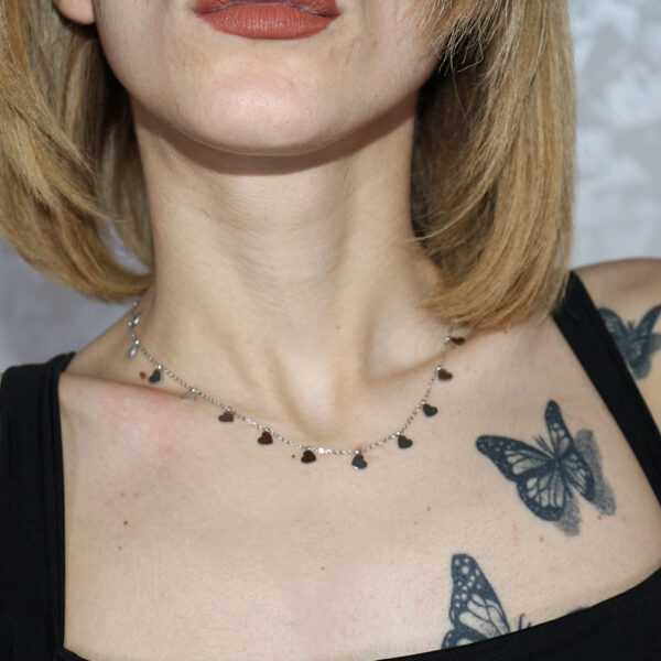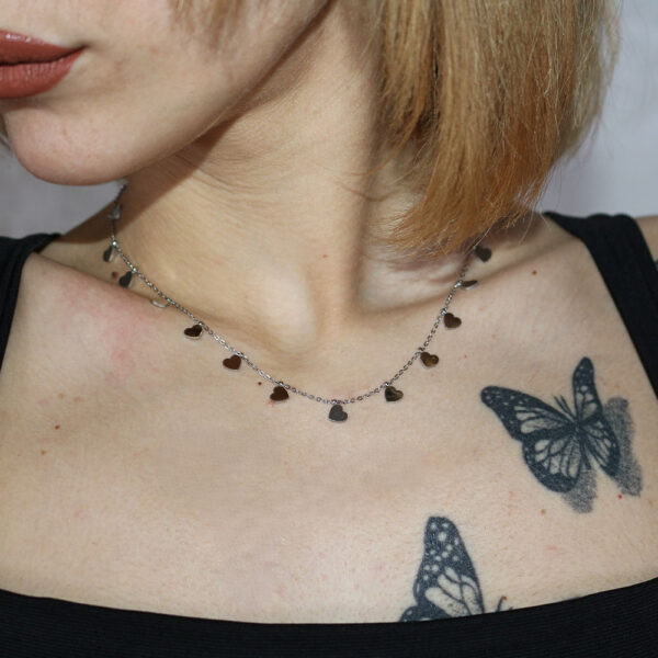 Aggiungi un tocco di romanticismo al tuo look con questa delicata collana in acciaio inossidabile. La catena sottile e resistente è arricchita da piccoli ciondoli a forma di cuore distribuiti uniformemente lungo tutta la lunghezza. Questo design moderno e raffinato rende la collana perfetta per ogni occasione, sia che si tratti di un evento speciale o di un look quotidiano. La qualità dell’acciaio inossidabile garantisce una lunga durata e una brillantezza che non sbiadisce nel tempo, mantenendo il suo splendore giorno dopo giorno. Indossa questa collana con fiducia e lascia che il tuo stile parli per te