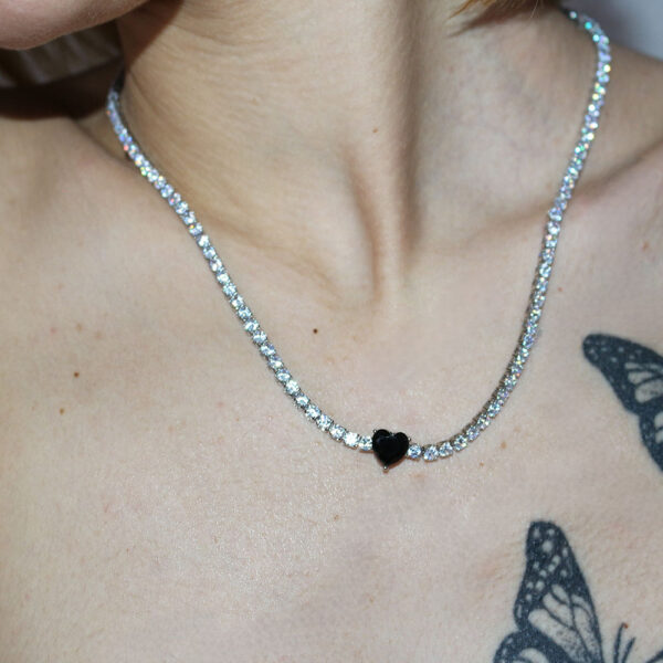 Questa raffinata collana in acciaio inossidabile è un gioiello versatile e moderno, ideale per aggiungere un tocco di eleganza a qualsiasi outfit. La catena sottile, decorata con pietre brillanti, si adatta perfettamente al collo, conferendo un aspetto delicato e raffinato. Il punto focale della collana è un ciondolo a forma di cuore, che dona un elemento di forte contrasto e un tocco di originalità. Il design semplice ma sofisticato del ciondolo ne fa un accessorio ideale sia per le occasioni formali che per un abbigliamento più casual.