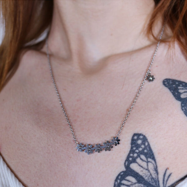 La collana Ivana della collezione Fiori è un gioiello delicato e raffinato, realizzato in acciaio inossidabile anallergico di alta qualità 316L. Questo materiale è resistente, duraturo e non provoca allergie o irritazioni alla pelle. La collana è composta da una serie di fiori intrecciati che formano il pezzo centrale, aggiungendo un tocco di eleganza e femminilità. I fiori sono rifiniti con cura e hanno una superficie lucida che riflette la luce. La collana ha una chiusura a moschettone regolabile, che ti permette di adattarla alla lunghezza che preferisci. La collana Ivana della collezione Fiori è un accessorio versatile e di tendenza, che puoi indossare in ogni occasione, sia di giorno che di sera. Regalati o regala a chi ami questa collana unica e di qualità, e fai risplendere il tuo stile con MAVIDA Gioielli.alta qualità 316L anallergico e inossidabile