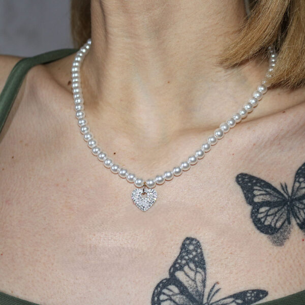 Questa splendida collana in acciaio inossidabile è un accessorio perfetto per aggiungere un tocco di eleganza e raffinatezza al tuo look. Realizzata con materiali di alta qualità, questa collana è progettata per durare nel tempo e mantenere la sua lucentezza senza appannarsi. Il design della collana presenta una serie di perle bianche uniformi, distribuite lungo tutta la lunghezza della catena. Al centro della collana, pende un ciondolo a forma di cuore, che aggiunge un tocco romantico e distintivo. Il ciondolo è decorato con piccoli cristalli scintillanti che catturano la luce in modo affascinante, creando un effetto visivo brillante e glamour.