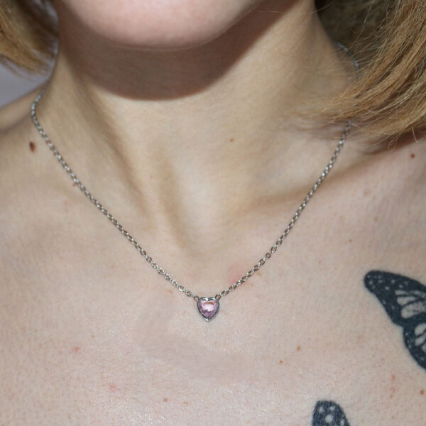 Questa elegante collana in acciaio inossidabile è un accessorio perfetto per ogni occasione. Realizzata con cura e precisione, questa collana presenta una catena sottile e raffinata, che si adatta comodamente al collo. Al centro della collana si trova un ciondolo a forma di cuore, che aggiunge un tocco romantico e delicato al design complessivo. Il ciondolo è ulteriormente impreziosito da un zircone scintillante, che cattura la luce in modo affascinante e dona un tocco di colore sofisticato. La combinazione di acciaio inossidabile e la pietra rosa crea un contrasto visivamente attraente, rendendo questa collana un pezzo versatile che può essere indossato sia di giorno che di sera.
