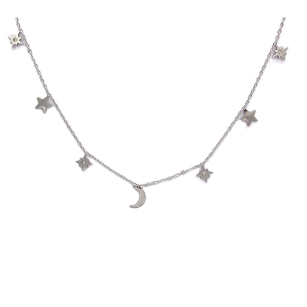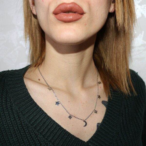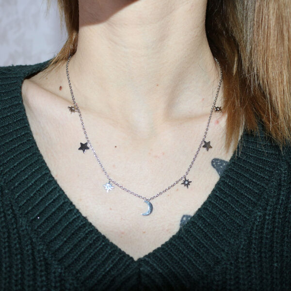 Se ami il fascino del cielo notturno, questa collana è fatta per te. Realizzata in acciaio inossidabile di alta qualità 316L, questa collana è anallergica e inossidabile, perfetta per chi ha la pelle sensibile. La collana è decorata con stelle e una luna pendente, che simboleggiano il mistero e la meraviglia dell’universo. Questa collana è elegante e raffinata, adatta a ogni occasione. Regalati o regala a qualcuno di speciale questa collana che brilla come le stelle.
