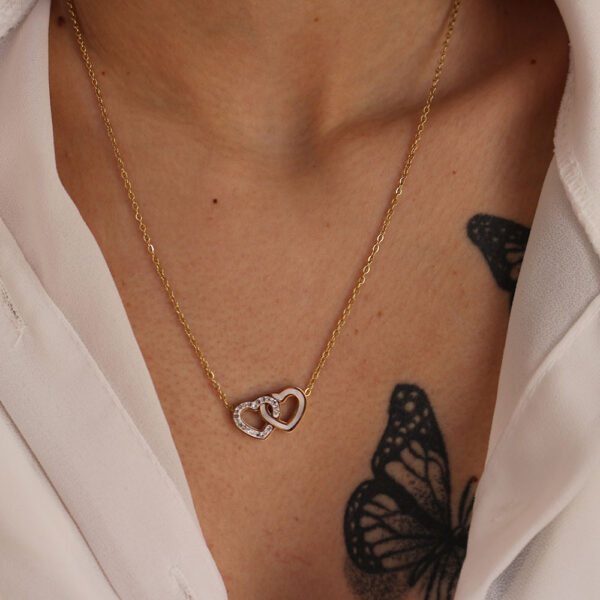 Questa raffinata collana in acciaio inossidabile è caratterizzata da una catena sottile e delicata, che sorregge un pendente composto da due cuori intrecciati. Uno dei cuori è impreziosito da piccoli cristalli brillanti, mentre l’altro ha una finitura liscia e lucida. Il design elegante e femminile di questa collana la rende perfetta per aggiungere un tocco di eleganza a qualsiasi outfit. Realizzata con materiali di alta qualità, questa collana è resistente alla corrosione e manterrà la sua lucentezza nel tempo. Ideale sia per occasioni formali che informali, è un regalo perfetto per celebrare momenti speciali come anniversari o San Valentino.