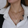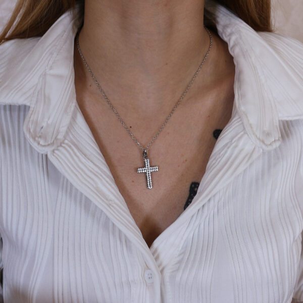 Questa elegante collana in acciaio presenta una catena sottile che sostiene un pendente a forma di croce. La croce è interamente ornata da piccoli zirconi scintillanti, aggiungendo un tocco di luce e raffinatezza. Perfetta per un look elegante e sofisticato, questa collana è ideale sia per occasioni formali che per l’uso quotidiano.