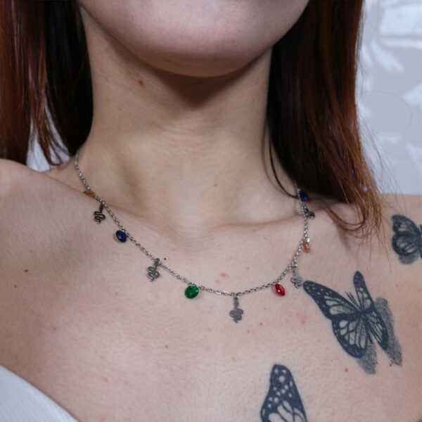 Se ami i gioielli colorati e fantasiosi, questa collana in acciaio inossidabile anallergico è la scelta perfetta per te. La collana ha una catena sottile e lunga, alla quale sono appesi dei piccoli ciondoli di varie forme e colori. I ciondoli sono realizzati in cristallo e hanno tonalità vivaci che si abbinano bene tra loro. Questa collana è ideale per dare un tocco di allegria e originalità al tuo look, sia che tu la indossi con un outfit casual che con uno più elegante. La collana è disponibile in un solo colore, che comprende il rosso, il verde, il blu e il bianco. Ordina ora la tua collana Martina Collezione Fantasia e ricevila in pochi giorni con la spedizione gratuita!