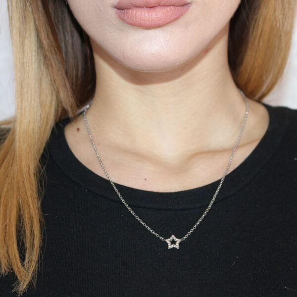 Questa elegante collana in acciaio presenta una catena sottile con un ciondolo a forma di stella. Perfetta per aggiungere un tocco di regalità e stile al tuo look quotidiano, è ideale per ogni occasione.