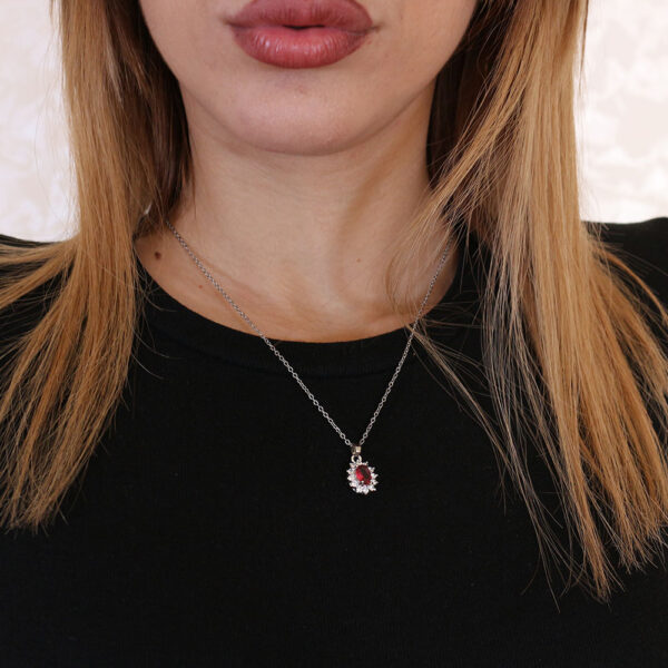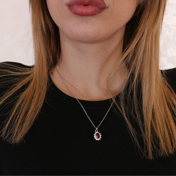 Questa elegante collana in acciaio inossidabile è caratterizzata da una catena sottile e resistente. Il ciondolo centrale, ornato da una pietra rossa incastonata in un’aura di piccoli cristalli trasparenti, aggiunge un tocco di colore e brillantezza. Perfetta per ogni occasione, questa collana è l’accessorio ideale per chi desidera un look sofisticato e moderno.
