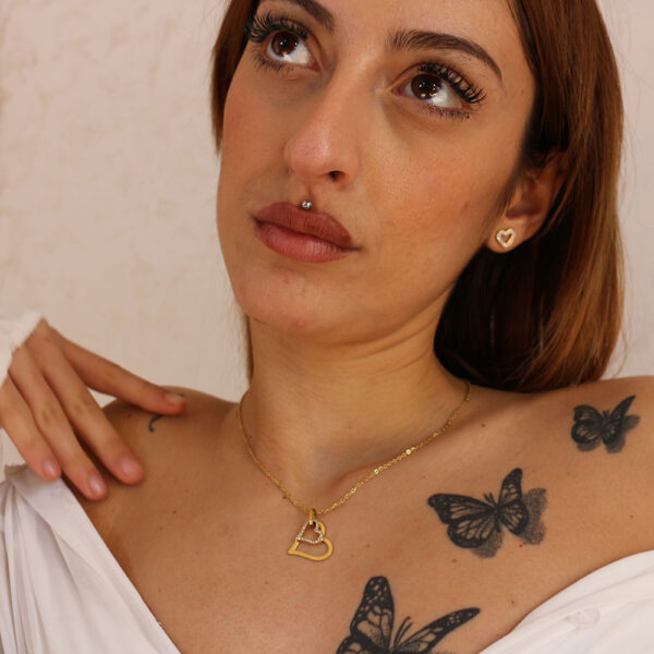 Questa elegante collana in acciaio inossidabile è caratterizzata da un ciondolo a forma di cuore. Il ciondolo è composto da due cuori sovrapposti: uno più piccolo e decorato con piccoli cristalli scintillanti, e uno più grande con un design semplice e liscio. La catena sottile e delicata si adatta perfettamente al collo, aggiungendo un tocco di raffinatezza e romanticismo al tuo look. Perfetta per ogni occasione, questa collana è ideale sia per un look casual che per eventi più formali. La qualità dell’acciaio inossidabile garantisce che la collana manterrà la sua lucentezza nel tempo, rendendola un accessorio duraturo e versatile.
