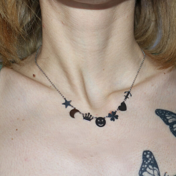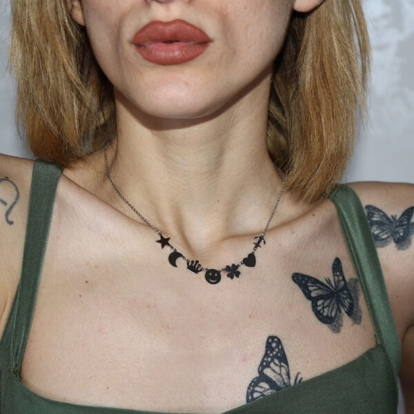 Questa collana in acciaio inossidabile è un accessorio unico e alla moda, perfetto per aggiungere un tocco di personalità al tuo look quotidiano. Il design presenta una serie di ciondoli neri di varie forme, inclusi una stella, una luna, una corona, un cerchio con stelle, un quadrifoglio, un cuore e un simbolo di Venere, rendendo ogni pezzo distintivo e affascinante.La qualità dell’acciaio inossidabile garantisce una lunga durata e resistenza alla corrosione, mantenendo la brillantezza nel tempo. La collana è ideale per chi ama esprimere il proprio stile attraverso dettagli unici e significativi. Indossala con fiducia e lascia che il tuo stile parli per te.