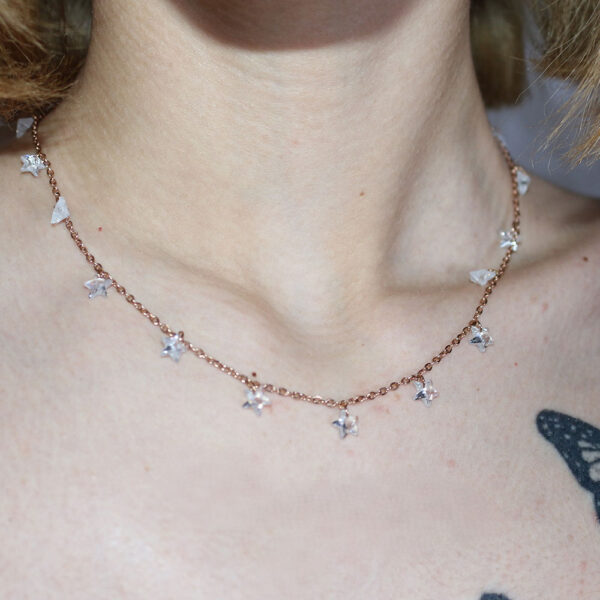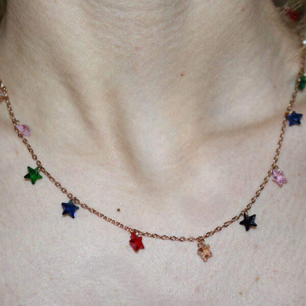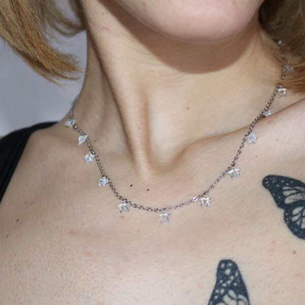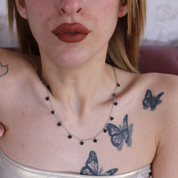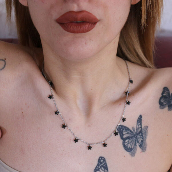 Se ami lo stile minimalista e raffinato, questa collana in acciaio inossidabile anallergico è il gioiello che fa per te. Questa collana è composta da una catenina sottile e leggera, alla quale sono appesi dei piccoli pendenti a forma di stella. I pendenti sono di colore scuro e hanno una superficie lucida, che riflette la luce e crea un bel contrasto con la catenina. La collana è ideale per chi cerca un accessorio distintivo e moderno, che si adatta a ogni look e occasione. È anche un regalo perfetto per chi ama le stelle e il cielo notturno. Questa collana è realizzata in acciaio inossidabile di alta qualità, noto per essere anallergico e inossidabile. Ti garantirà comfort e durata nel tempo, senza perdere il suo fascino.