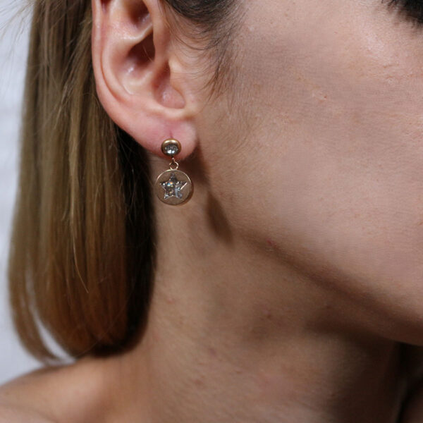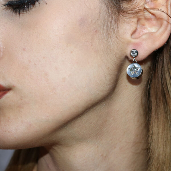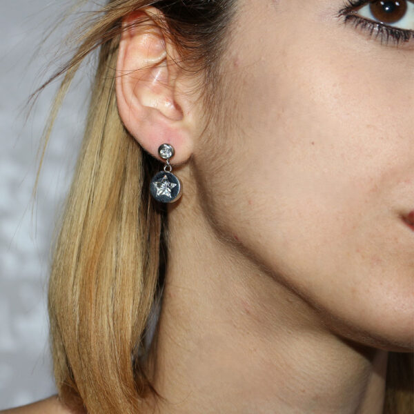 Questi orecchini sono un gioiello di classe e qualità, realizzati con materiali ipoallergenici e resistenti. Gli orecchini sono composti da due elementi: una base rotonda con un piccolo cristallo incastonato, e un cristallo a forma di stella che pende dalla base. I cristalli sono di colore grigio metallizzato e riflettono la luce con effetti scintillanti. Gli orecchini sono adatti per ogni occasione, grazie al loro stile che unisce modernità e classicismo.