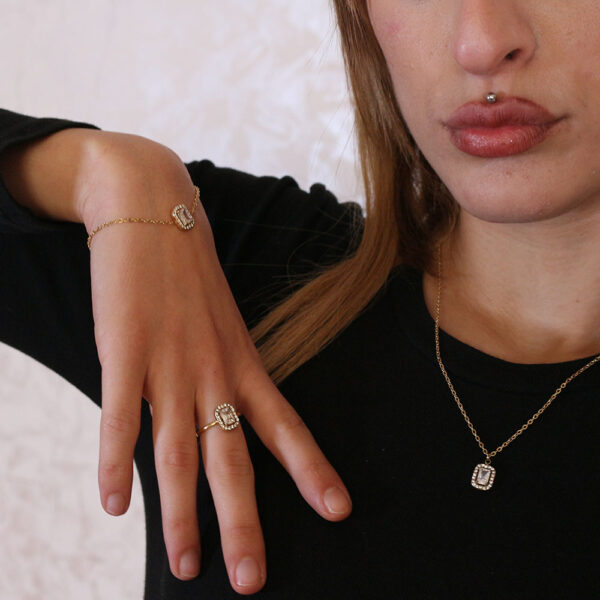 Elegante parure in acciaio inossidabile, ipoallergenica e perfetta per ogni occasione. Composta da collana, bracciale e anello, ogni pezzo si distingue per il design raffinato: pendenti rettangolari impreziositi da una pietra centrale, circondata da delicate pietre più piccole. La collana presenta una catena sottile e moderna, il bracciale un tocco minimalista, e l’anello completa il look con la sua forma geometrica sofisticata. Resistente, sicura per pelli sensibili e irresistibilmente chic, questa parure è un connubio di stile e comfort