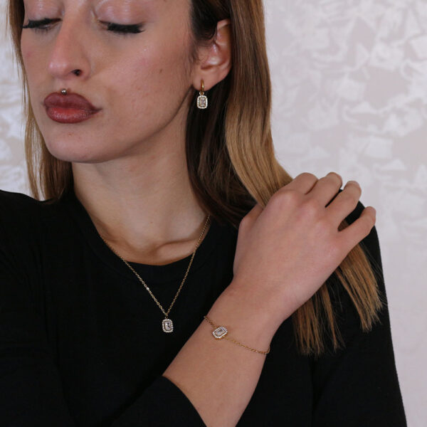 La parure è composta da una collana, un bracciale e un paio di orecchini, tutti realizzati in acciaio inossidabile anallergico. La collana presenta un ciondolo rettangolare decorato con pietre brillanti, mentre il bracciale include un elemento centrale coordinato con il design della collana. Gli orecchini pendenti riprendono lo stesso stile rettangolare e brillante. Questa parure è ideale per chi cerca gioielli eleganti e raffinati, ma anche pratici e sicuri per la pelle sensibile