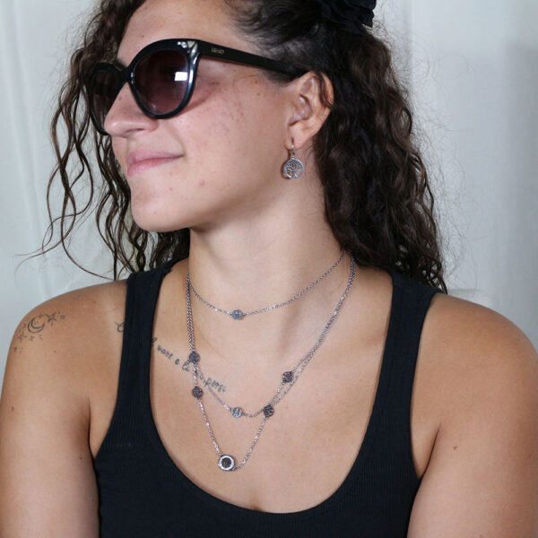 La collana, dal design raffinato e moderno, è composta da tre fili di catena che si intrecciano armoniosamente. I ciondoli pendenti, che raffigurano il simbolo dell’albero della vita, sono ricchi di dettagli accuratamente lavorati, riflettendo luce con delicatezza e donando una nota di brillantezza. Simbolo di connessione, crescita e stabilità, l’albero della vita aggiunge un tocco di spiritualità e raffinatezza a questo pezzo. Gli orecchini coordinati, dal design semplice ma di grande impatto, riprendono il motivo dell’albero della vita. La loro leggerezza e la chiusura sicura li rendono confortevoli da indossare ogni giorno, mentre la loro estetica versatile li rende perfetti per accompagnarti sia in contesti informali che in occasioni eleganti. Realizzata interamente in acciaio 316L inossidabile, questa parure garantisce durabilità eccezionale e resistenza alla corrosione, mantenendo intatta la sua bellezza nel tempo. Questo materiale ipoallergenico è ideale anche per le pelli più sensibili, offrendo comfort e sicurezza.