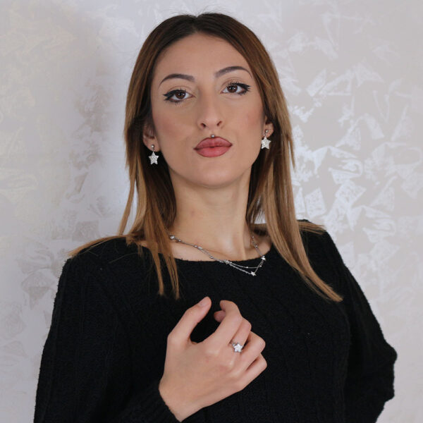 Questa raffinata parure comprende una collana, un paio di orecchini pendenti e un anello, tutti realizzati in acciaio inossidabile di alta qualità con una finitura dorata lucida. La collana presenta un design moderno con un pendente centrale a forma di stella, decorato da dettagli brillanti che catturano la luce e impreziosiscono il look. Gli orecchini, anch’essi a forma di stella, sono pendenti e aggiungono movimento e glamour al set. L’anello, regolabile e coordinato agli altri pezzi, completa la parure con un tocco sofisticato. Perfetto per chi ama gli accessori che combinano stile e versatilità, questo set è ideale per ogni occasione, dalle serate eleganti agli outfit quotidiani, e rappresenta anche una splendida idea regalo. Esalta il tuo stile con un tocco di magia stellare