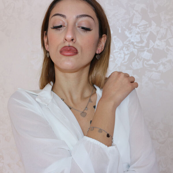 Questa collana presenta un design moderno e sofisticato, arricchito da un pendente a forma di cuore, simbolo di amore e romanticismo. Il cuore è accompagnato da piccoli charm che riflettono la luce, creando un effetto luminoso e attraente. La collana è regolabile, permettendo di adattarla a diverse scollature, rendendola perfetta per ogni occasione, dai look quotidiani agli abiti da sera. Gli orecchini coordinati completano armoniosamente la parure, anch’essi caratterizzati da una delicata forma di cuore che richiama il pendente della collana. Leggeri e comodi, gli orecchini sono ideali da indossare tutto il giorno, aggiungendo un tocco di eleganza senza rinunciare al comfort. Il loro design semplice ma sofisticato li rende adatti a qualsiasi outfit, valorizzando il viso con una nota di brillantezza. Il bracciale è l’elemento finale che arricchisce questa parure. Realizzato con una catena regolabile in acciaio inossidabile, il bracciale riprende lo stesso motivo della collana e degli orecchini con piccoli charm e pendenti a forma di cuore. Questo accessorio versatile è pensato per offrire una vestibilità perfetta e un tocco di stile unico che accompagna chi lo indossa in ogni occasione.
