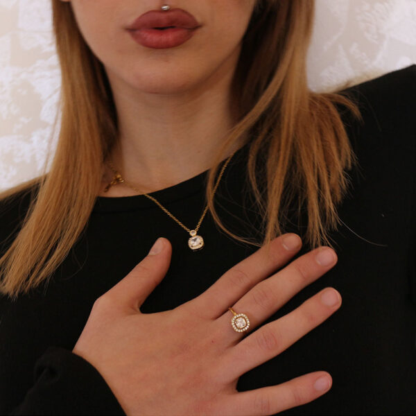 Aggiungi un tocco di eleganza senza tempo al tuo stile con questa splendida parure composta da collana e anello. Realizzati in acciaio inossidabile placcato oro, questi gioielli uniscono resistenza e raffinatezza, garantendo lucentezza e durabilità nel tempo. La collana è impreziosita da un pendente centrale con una pietra sfaccettata trasparente, incorniciata da pietre più piccole che esaltano il design. L’anello, abbinato, presenta lo stesso motivo raffinato, per un look armonioso e sofisticato. Questa parure è ipoallergenica, perfetta anche per le pelli più sensibili, e rappresenta l’accessorio ideale per ogni occasione, che sia un evento speciale o un regalo prezioso.”