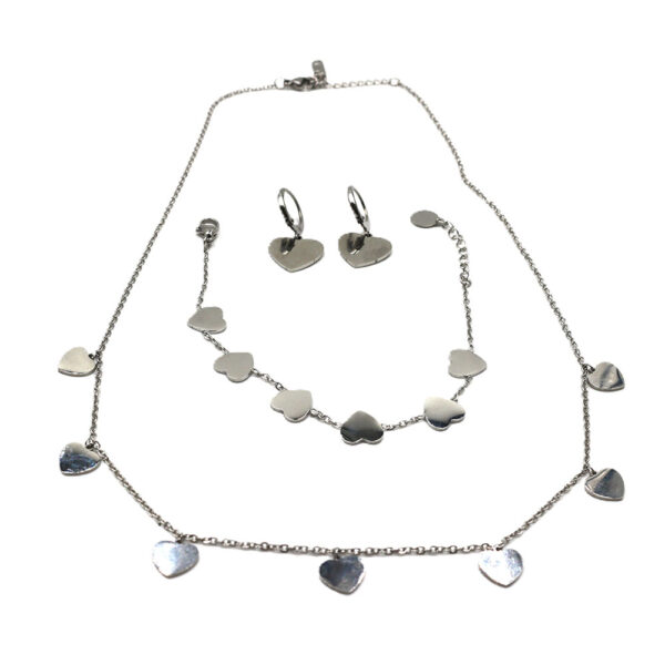 Questa elegante parure è composta da collana, bracciale e orecchini, realizzati in acciaio inossidabile di alta qualità, noto per la sua resistenza e durata nel tempo. Il materiale è ipoallergenico, ideale per chi ha la pelle sensibile o allergie ai metalli. Collana dal Design moderno con piccoli dischi piatti e lucidi che riflettono la luce, creando un effetto sofisticato. La lunghezza è regolabile per adattarsi a diverse preferenze di stile. Il bracciale coordinato alla collana, presenta lo stesso motivo di dischi piatti. Chiusura sicura e regolabile per garantire comfort e praticità. Gli orecchini sono a forma di cuore, simbolo di eleganza e romanticismo. Leggeri e comodi da indossare, perfetti per completare il look. Questa parure è ideale per ogni occasione, dal quotidiano agli eventi speciali, e rappresenta un regalo perfetto per chi ama accessori raffinati e versatili.
