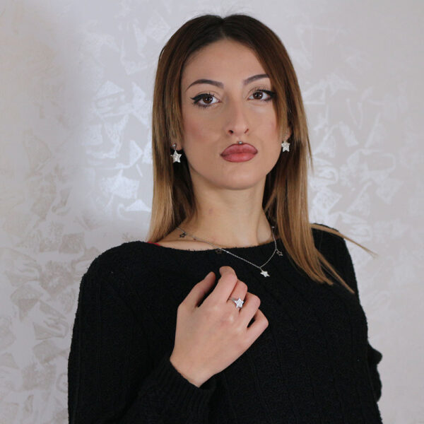 Lasciati conquistare dalla raffinatezza senza tempo della nostra parure, composta da collana, orecchini e anello, tutti caratterizzati da un design a forma di stella. Questa parure unisce stile moderno e materiali di alta qualità per offrirti un accessorio che puoi indossare con fiducia e comodità ogni giorno. Realizzata in acciaio inossidabile anallergico, questa parure garantisce resistenza alla corrosione e una lunga durata, senza compromettere il comfort. È perfetta per chi ha la pelle sensibile e desidera evitare reazioni allergiche, mantenendo comunque un look sofisticato. La finitura lucida dell’acciaio inossidabile dona luminosità e fa risaltare il design delle stelle, rendendo ogni pezzo un’opera d’arte.