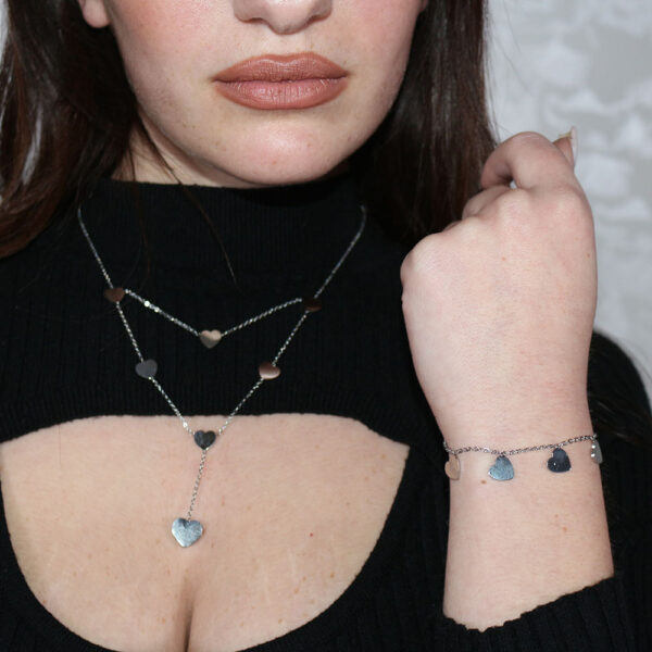 Collana e bracciale in acciaio inossidabile anallergico: un set elegante e versatile, ideale per ogni occasione. La collana è caratterizzata da una serie di piccoli cuori collegati da una sottile catena, con un cuore centrale pendente che dona un tocco raffinato e romantico al design. Il bracciale, in perfetta armonia con la collana, presenta lo stesso motivo di cuori collegati, creando un look coordinato e sofisticato. Realizzati in acciaio inossidabile di alta qualità, entrambi i gioielli sono resistenti, durevoli e ipoallergenici, perfetti anche per chi ha la pelle sensibile. La finitura lucida esalta la bellezza del design, rendendo questi accessori perfetti sia per il quotidiano che per eventi speciali. Un regalo perfetto per celebrare momenti importanti o un’aggiunta di stile alla propria collezione di gioielli, questo set combina estetica e funzionalità senza compromessi. Un’opzione senza tempo per chi desidera accessori pratici e affascinanti. Fammi sapere se desideri ulteriori personalizzazioni per la descrizione!